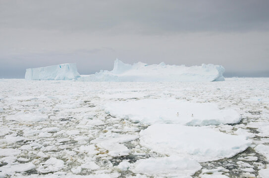 Two Adelie penguins stand amidst pack ice in the French Passage off the coast of Antarctica.
