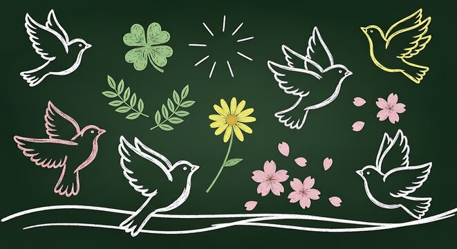 Chalkboard birds and flowers including clover blossom elements form unique decorative pattern is visible