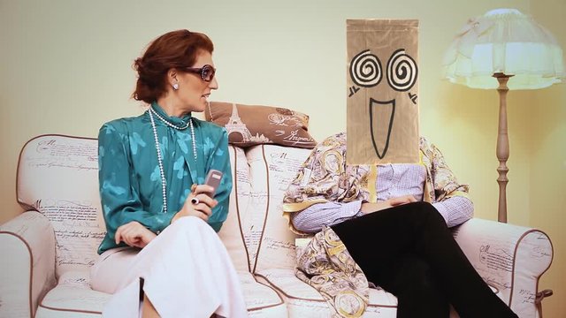 A logorrheic harsh wife keeps talking and watching the tv, while the husband is lost in a mind trip (he wears a breadbag face). Funny comedic shot.