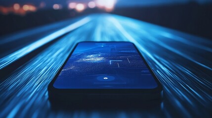 A smartphone lies on a futuristic, glowing surface, representing the speed and power of modern technology.