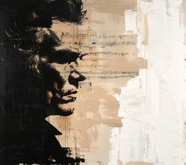 Artistic illustration of composer ludwig van beethoven with intense gaze set against a vintage sheet music background, capturing his timeless legacy