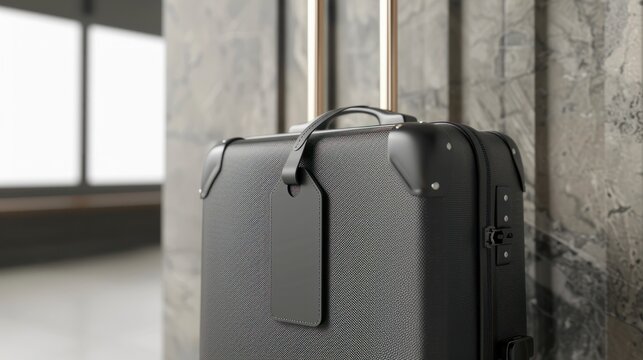 Hanging luggage tag mockup with strap on a stylish black and beige travel bag in a realistic setting designed for branding and promotional purposes