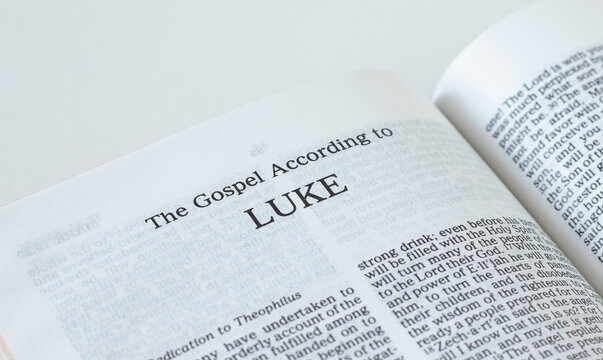 Luke Gospel from Holy Bible Book inspired by God and Jesus Christ, a closeup. New Testament Scripture isolated on a white background.