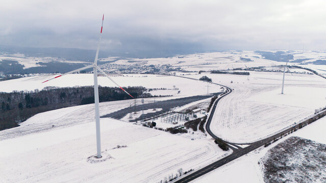 Wind turbine and solar panel in snow, dark doldrums or wind lull in winter, no renewable sustainable energy, environmental conversation