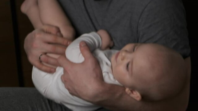 Father lulling to sleep his little son. Toddler baby boy lying in father's arms. Father's day, parenthood concept.