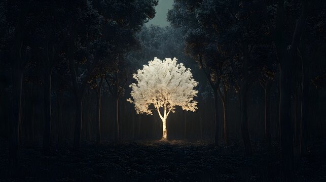Glowing White Tree in a Dark Forest. Mysterious Nighttime Scene