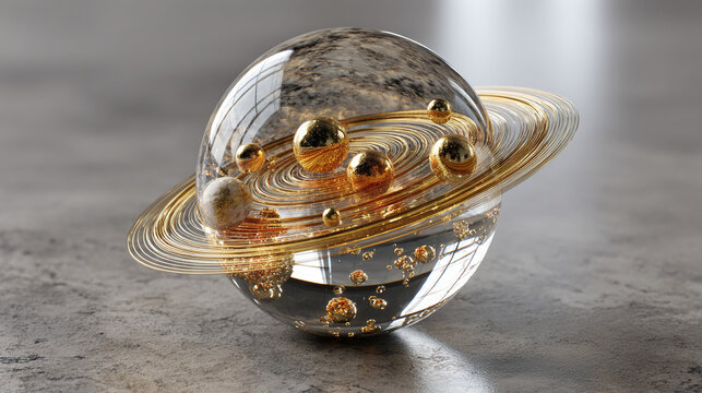A luminous crystal sphere encapsulating the entire solar system—planets, stars, and orbits suspended in refracted light, symbolizing cosmic harmony and fragility.