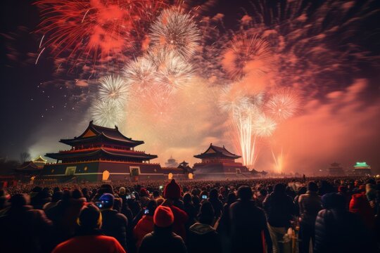 Fireworks and Festivities Photograph of Chinese new year fireworks celebrations on the chinese temple background