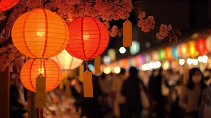 Vibrant chinese lunar celebration at night market with red lanterns and cherry blossoms