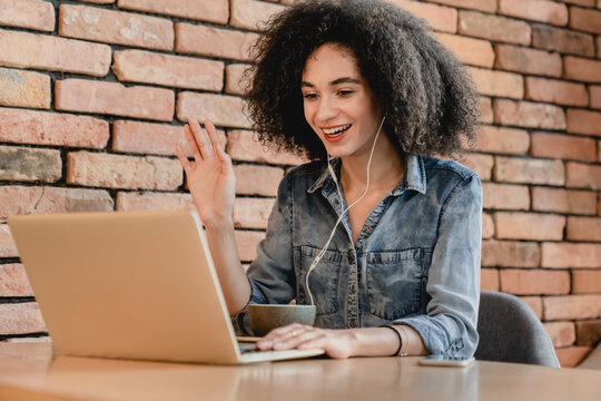 Cheerful young african woman talking online on laptop in cafe, having remote conversation on videocall conference meeting with colleagues, teacher tutor coach trainer. E-learning concept