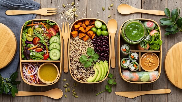 Eco-friendly bamboo lunch boxes filled with organic plant-based meals placed on wooden background, promoting sustainability, healthy lifestyle, and zero waste concepts.
