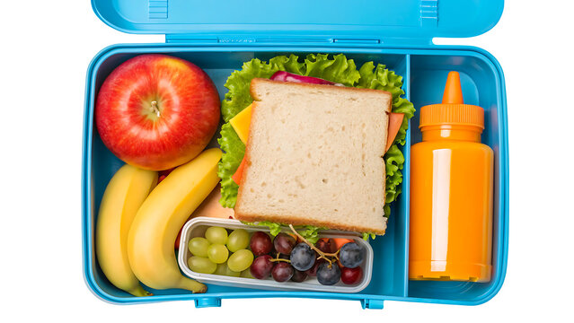 Healthy lunchbox ideas for kids with sandwich apple banana and grapes for school lunch isolated on transparent background