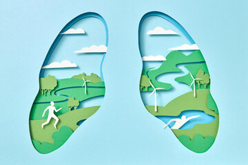 Model of lungs with natural ecosystem and man riding a bike handmade from paper.