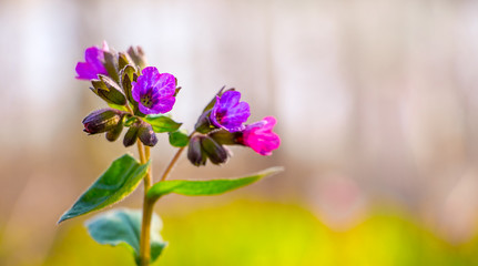 Pink and purple  flowers of pulmonaria (lungwort) on a light blurred background. Copy space_