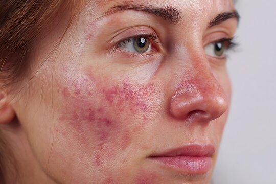 Closeup image of womans red facial rash caused by lupus allergy. Concept Skin Conditions, Lupus Allergy, Facial Rash, Closeup Image, Women's Health