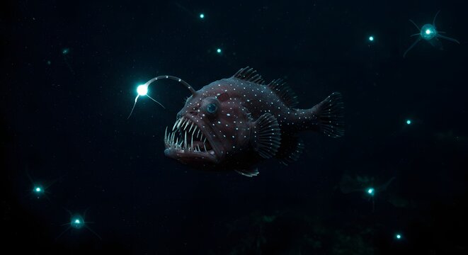 A menacing deep-sea anglerfish swims through the dark abyss, its bioluminescent lure glowing brightly to attract prey.