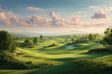 Scenic Countryside Golf Course with Flags, Lush Greens, and Sand Bunkers. Hand-drawn Cartoon Vector Illustration