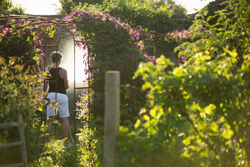 Woman watering plants and flowers in sunny lush idyllic summer garden