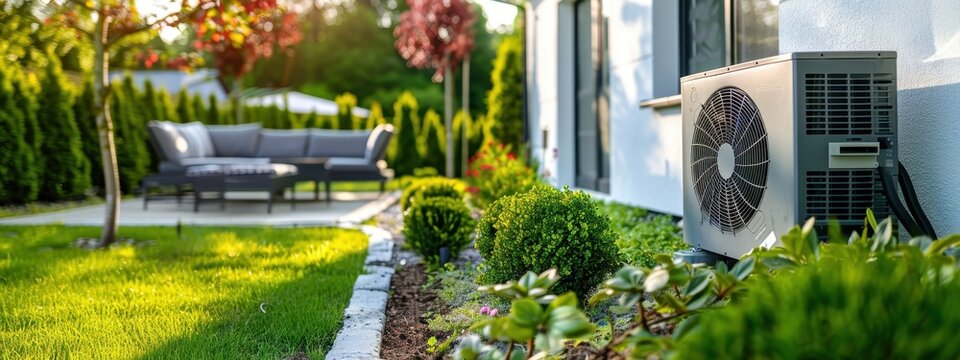 Modern heat pump in residential garden with patio seating and lush greenery