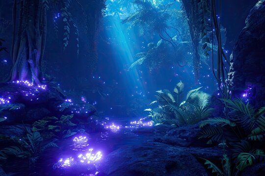 Lush alien jungle with bioluminescent flora in an extraterrestrial 3D environment, immerses observers in fantastical landscapes.