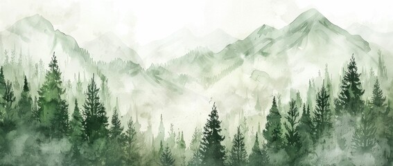 Serene watercolor landscape featuring misty mountains and lush evergreen trees in soothing green tones