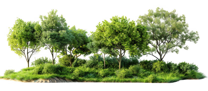 A cluster of lush green plants and vibrant trees on rocky terrain, showcasing a natural habitat with rocks and foliage, isolated on a white background.