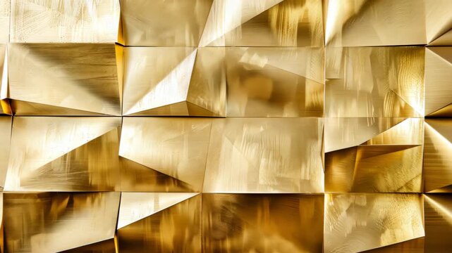 Golden Geometric Elegance: A close-up view reveals a striking wall composed of geometric panels, where light dances on the textured gold surface, creating a dynamic play of shadow and light.