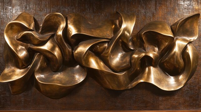 A polished brass relief sculpture featuring abstract entwined forms with a rich bronze patina and lustrous metallic surface detail