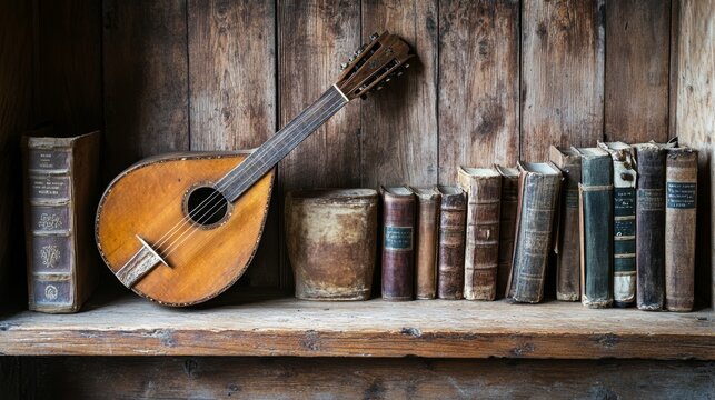 Beautiful old lute and antique books on a rustic old wooden shelf.