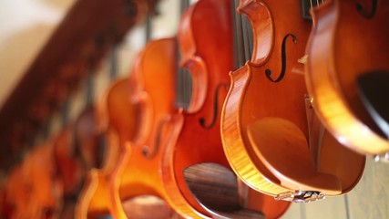 Cinematic shot of master artisan luthier working on creation of handmade fine quality wood violin in his creative workshop. Concept of spiritual instrument, handmade, art, orchestra, artisan, music.