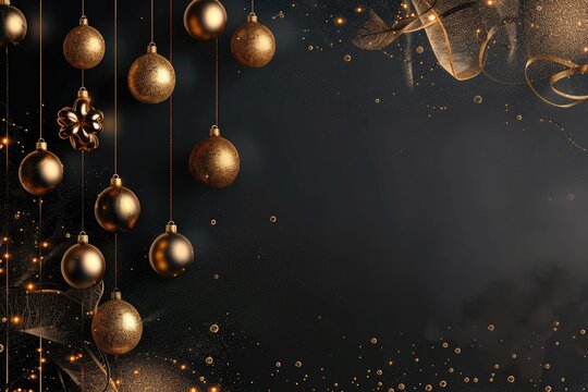 Luxurious black and gold celebration frame with blank copy space surrounded by balloons and confetti