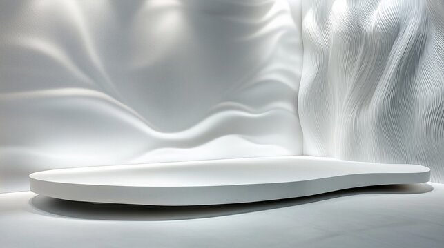 A sleek white platform placed against textured white walls with flowing, elegant designs, softly lit by ambient gradient lighting, creating a modern and luxurious space for product displays.