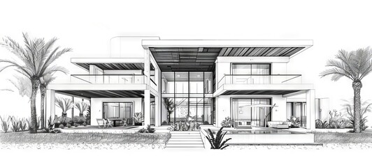 Black and white sketch of a modern luxurious house, concept of architectural design, home planning, architectural drawing
