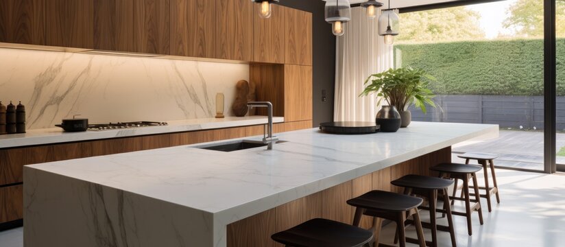 Minimalistic kitchen design with wooden island and marble top