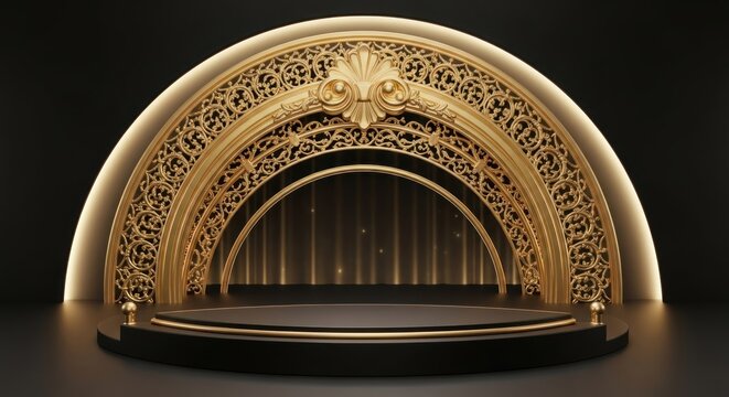 A luxurious black and gold stage with intricate gold designs and a black curtain backdrop.