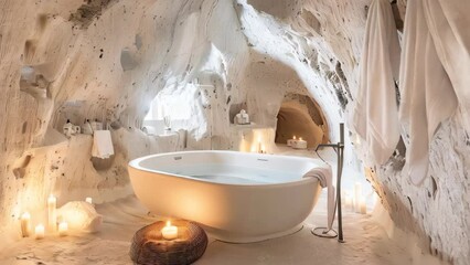 A luxury white bathtub in a cave illuminated by candles