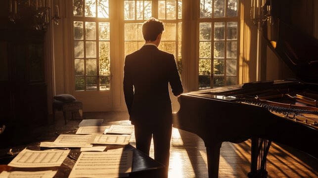 A man in a suit stands by a grand piano, bathed in warm sunlight streaming through large windows, surrounded by sheet music and beauty.