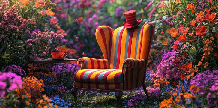 An imaginative armchair setup with a vibrant Mad Hatter costume, teacup, and saucer, surrounded by magical flowers and accessories, evoking a whimsical fashion and cosplay vibe