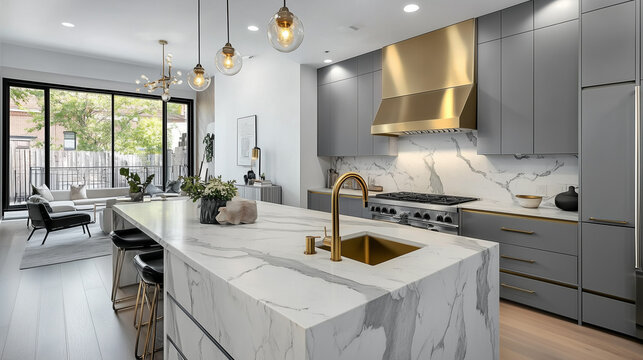 "Modern kitchen with a marble island and grey cabinets in a luxury apartment, featuring a white countertop and golden faucet, representing contemporary home interior design and stylish living space."