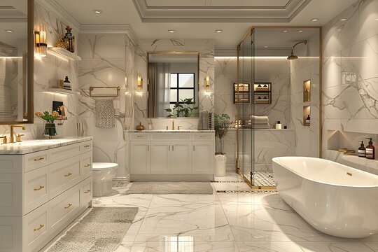 Hollywood Regency-style glam bathroom with marble floors and brass fixtures.