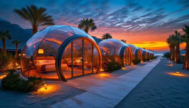 Modern igloo tents designed for luxury desert camping, set against a twilight sky filled with stars.Geodesic domes.