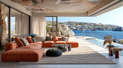 A large, open living room with a view of the ocean. The room is furnished with a couch, a coffee table, and a rug. The room has a modern and spacious feel