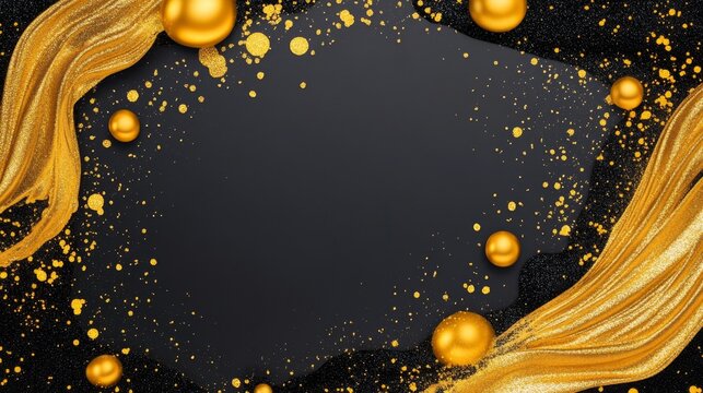 Elegant Black Gold Luxury Frame - Opulent black background, gold spheres, chic golden ribbons, sophisticated design, luxury feel.