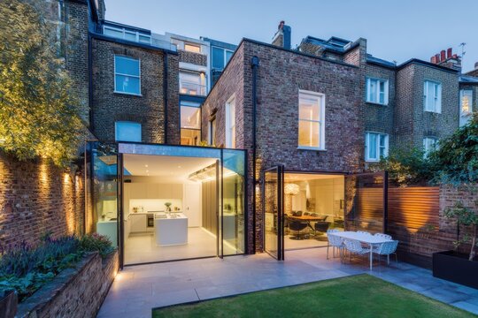 Modern glass extension and backyard of a stylish urban home in London during twilight, showcasing contemporary design and open living spaces
