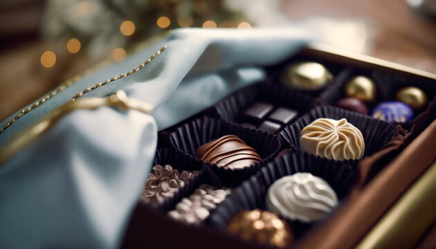 Chocolates and chocolate pralines in a gift box as a luxury holiday present, generative ai