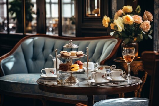 Elegant high tea setup, luxury afternoon relaxation.