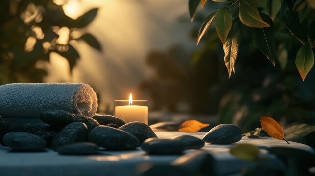 Spa atmosphere with rocks and bottles of essential oils on the table. This layout shows the serenity for relaxation or body treatment in a luxury spa resort hotel