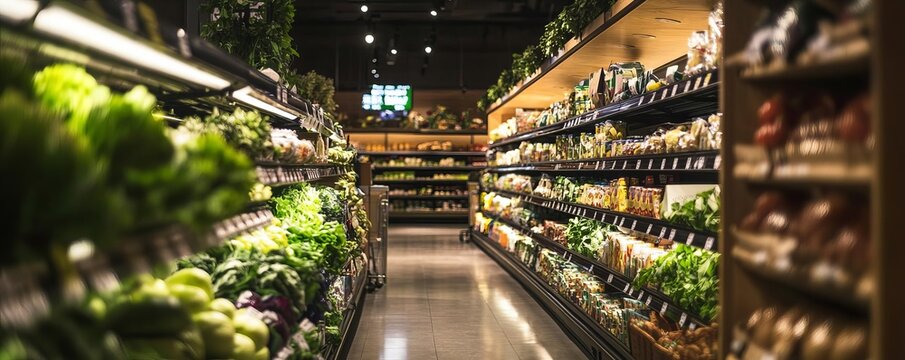 A grocery store with only the highpriced organic section lit, symbolizing economic shifts towards luxury food markets