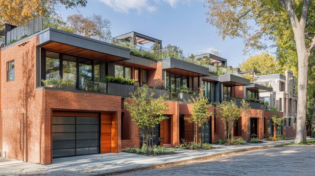 Modern, wood-clad townhouses nestled amongst lush greenery.  Spacious, contemporary homes with sleek design elements
