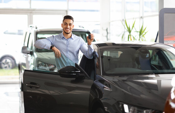 Wealthy middle eastern businessman buying new car in luxury auto showroom, cheerful arab guy standing by nice black sports automobile, showing key and smiling at camera, copy space